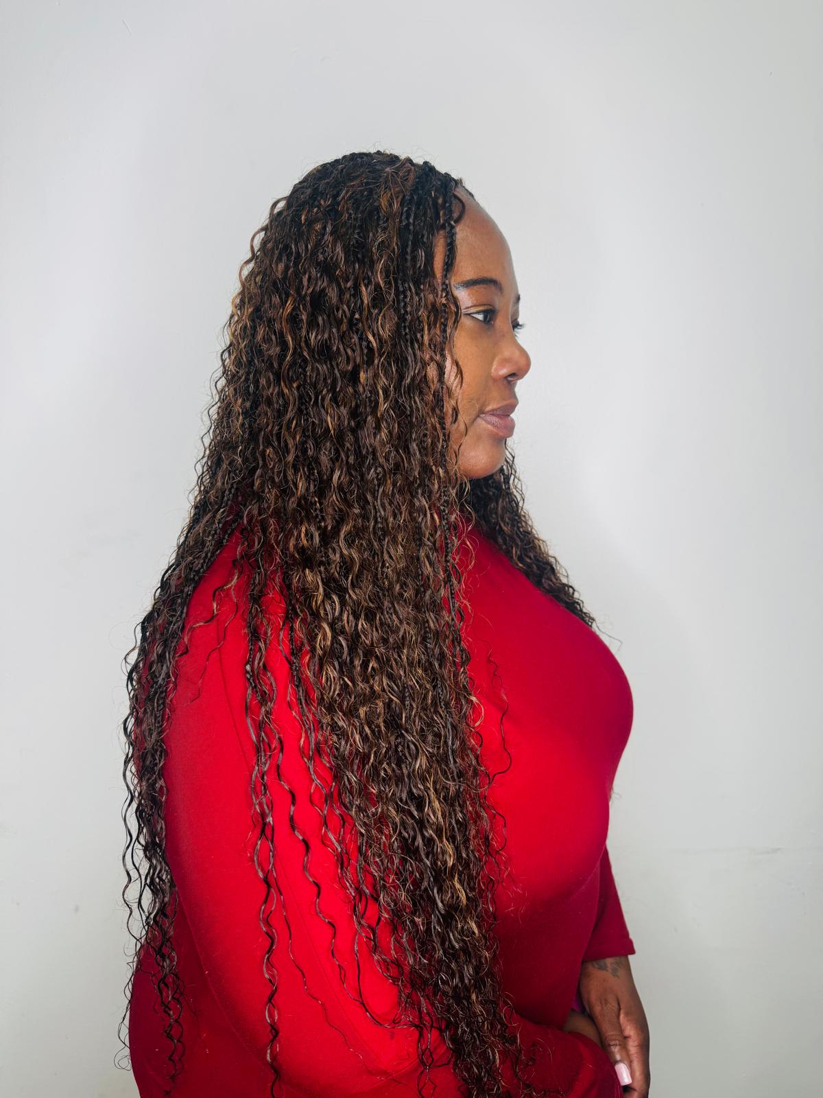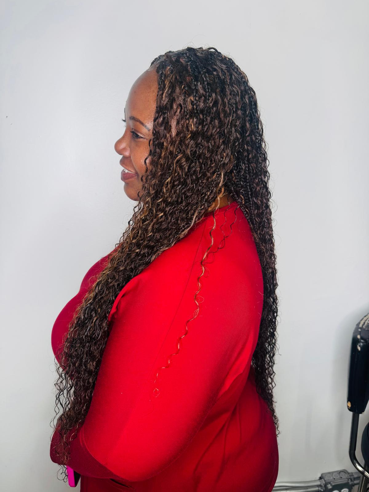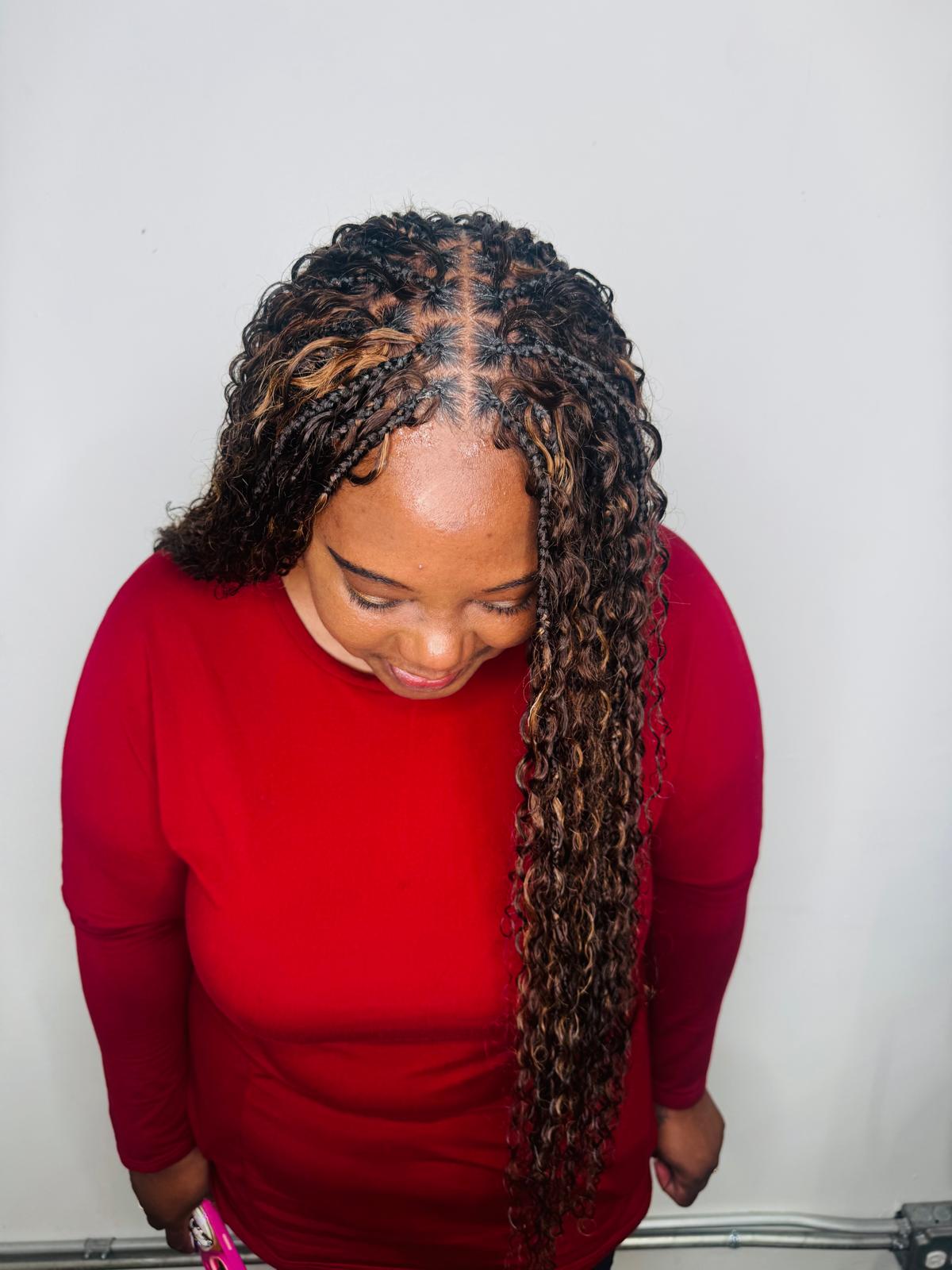 A messy-chic version of knotless braids with curly ends and loose curls throughout the length.